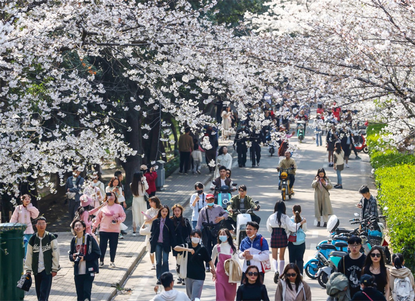 Los turistas admiran los cerezos en flor en la Universidad de Wuhan, en Wuhan, provincia de Hubei, el 15 de marzo de 2023.