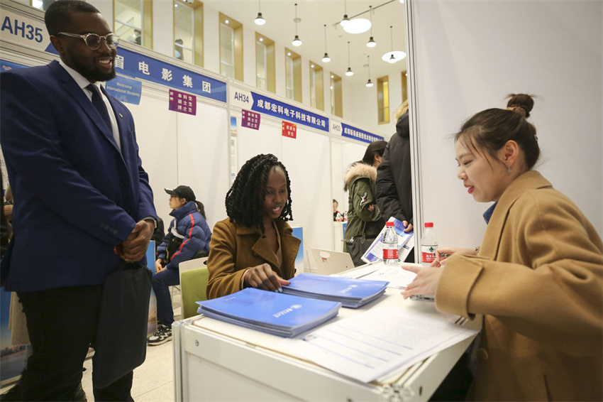 En la feria de empleo a gran escala para graduados de 2023 en la Universidad de Tsinghua, algunos graduados extranjeros que buscan empleo están conociendo más sobre los puestos en una empresa el 16 de marzo.