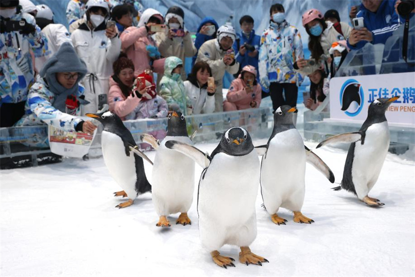 Los pingüinos papúa recibieron a los visitantes en el nuevo Grandview Penguin Snow World en Guangzhou.