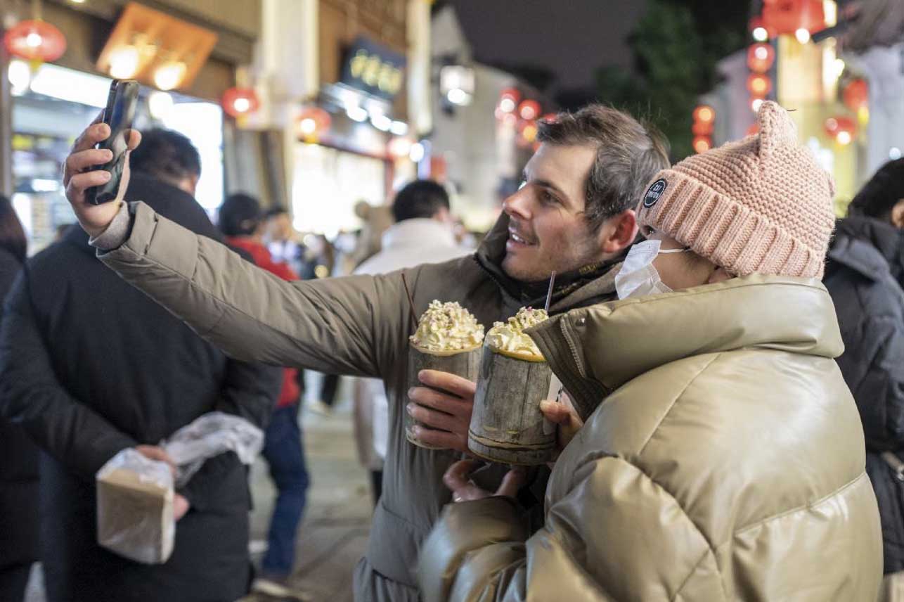 Turistas extranjeros posan en Suzhou, provincia oriental de Jiangsu, 1 de febrero de 2023.