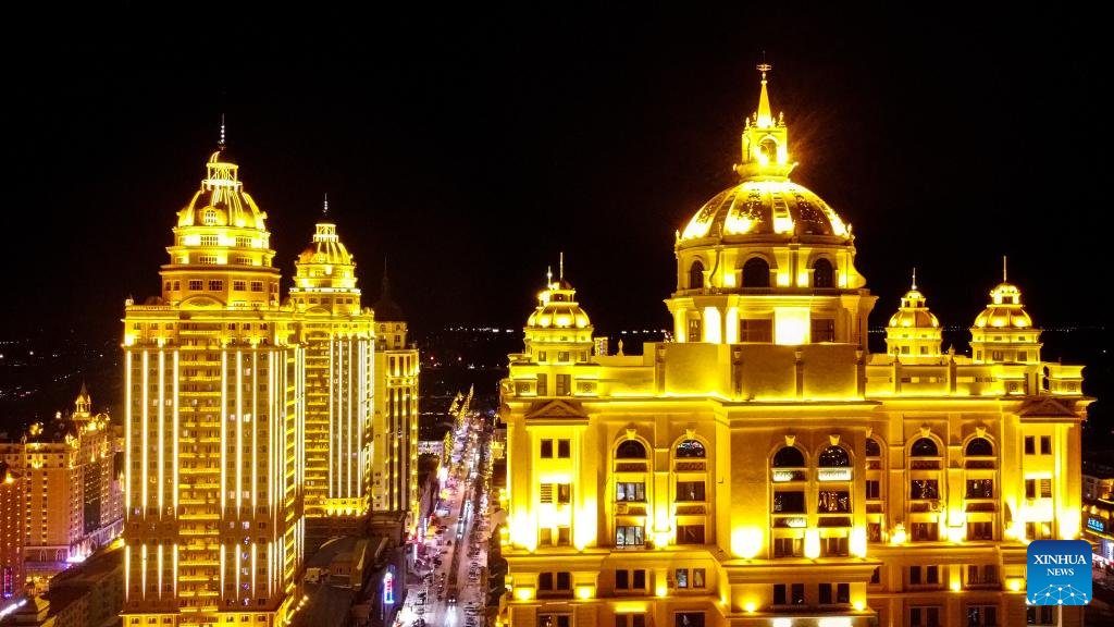Vista nocturna de Manzhouli, Mongolia Interior, norte de China