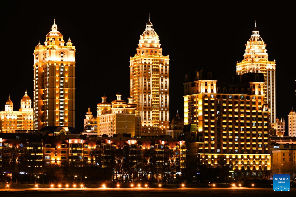 Vista nocturna de Manzhouli, Mongolia Interior, norte de China
