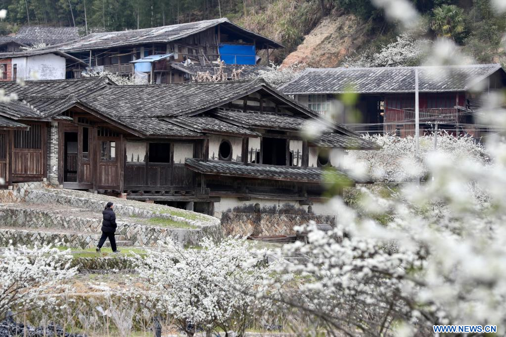 Imagen del 24 de febrero de 2023 de flores de ciruelo vistas cerca de edificios antiguos, en la aldea de Gaiyang del distrito de Yongtai, en la provincia de Fujian en el sureste de China. Las aldeas antiguas del distrito de Yongtai han estado atrayendo a muchos turistas ya que los ciruelos florecen a principios de primavera.
