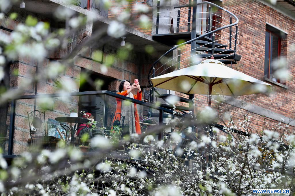 Imagen del 24 de febrero de 2023 de una turista tomando fotografías de flores de ciruelo, en la aldea de Daxi del distrito de Yongtai, en la provincia de Fujian, en el sureste de China. Las aldeas antiguas del distrito de Yongtai han estado atrayendo a muchos turistas ya que los ciruelos florecen a principios de primavera.