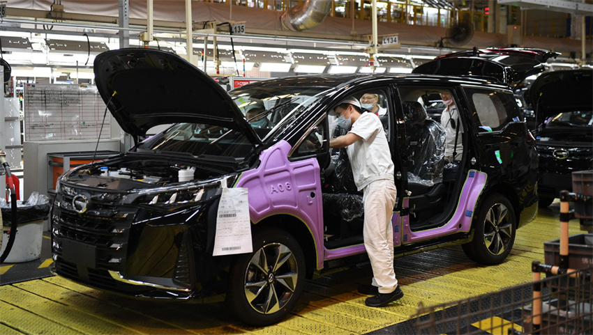Los empleados trabajan en las líneas de montaje de GAC Motor, en Guangzhou, provincia de Guangdong, el 20 de marzo de 2023.