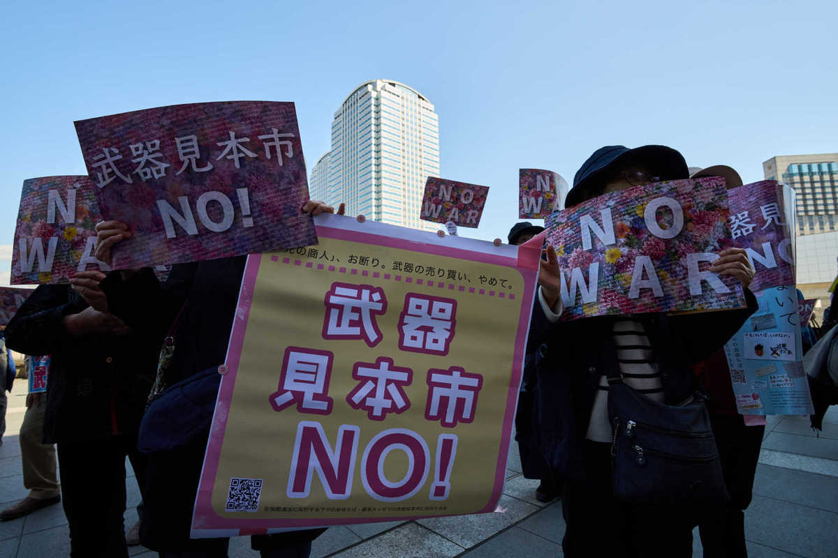 La gente protesta frente al centro de convenciones de Makuhari Messe en la prefectura de Chiba, Japón, el 15 de marzo de 2023. Cientos de japoneses se reunieron frente a la sede de una feria de equipos militares cerca de Tokio el miércoles para protestar por la decisión de Japón de intensificar su comercio de armas. El evento de tres días, DSEI Japón 2023, comenzó el miércoles en el centro de convenciones de Makuhari Messe en la prefectura de Chiba, al este de Tokio. [Foto/Xinhua]