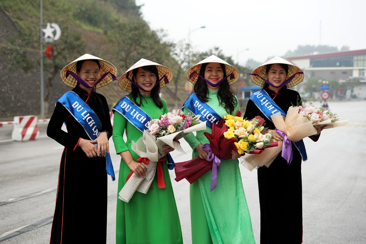 Miembros del personal vietnamita dan la bienvenida con ramos de flores a turistas chinos en el Paso Fronterizo Internacional Huu Nghi en la provincia de Lang Son, en el norte de Vietnam, el 15 de marzo de 2023. La autoridad de turismo de Vietnam y el comité popular provincial del norte de Lang Son celebraron una ceremonia el miércoles para dar la bienvenida al primer grupo de turistas chinos en tres años desde la pandemia de COVID-19. [Foto/Xinhua]