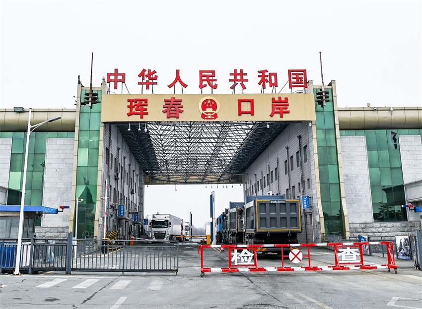 Camiones cruzan la entrada por carretera de Hunchun, 22 de marzo.
