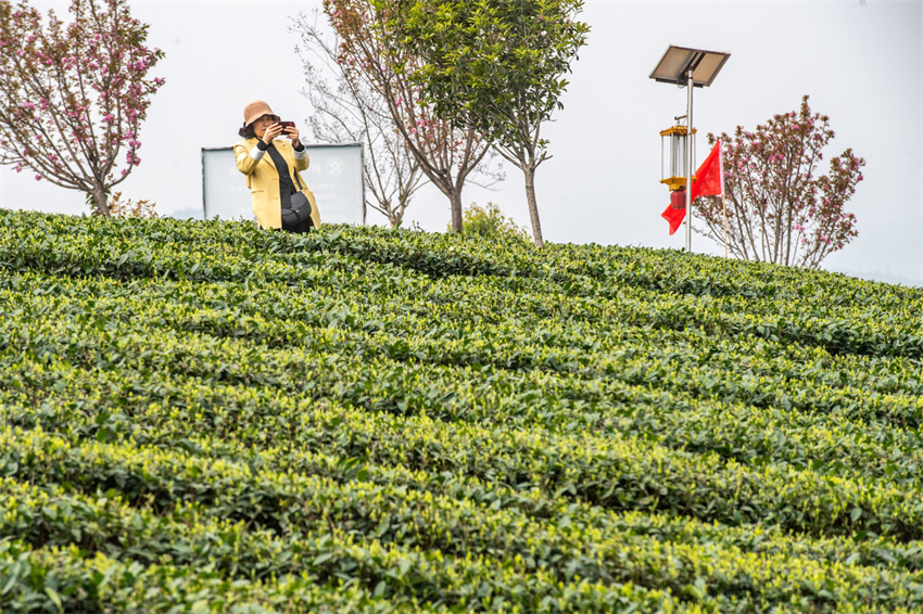 Una turista toma fotos en un campo de té en el distrito de Yongchuan de Chongqing el 22 de marzo. [Foto/Xinhua]