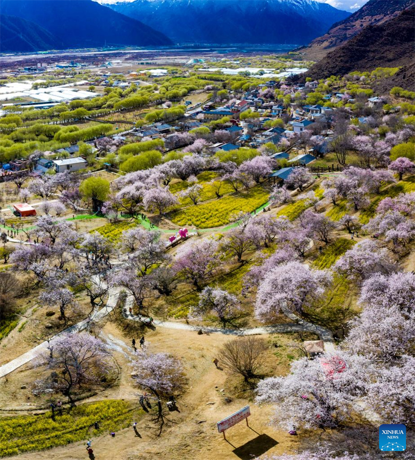 Esta foto aérea tomada el 24 de marzo de 2023 muestra flores de durazno en la aldea de Gala de Nyingchi, en la región autónoma del Tíbet, en el suroeste de China. (Xinhua/Jiang Fan)