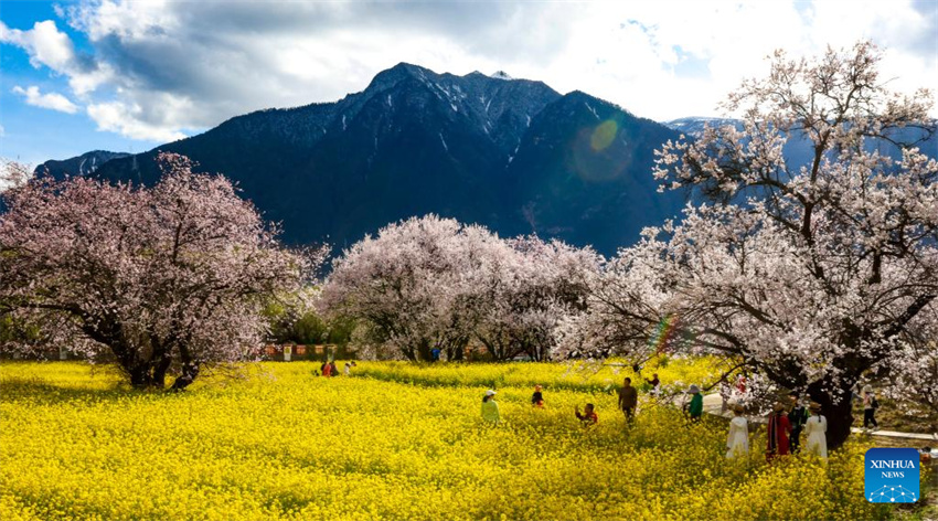 Turistas visitan un jardín de flores de durazno en la aldea de Gala, ciudad de Nyingchi, región autónoma del Tíbet, en el suroeste de China, el 24 de marzo de 2023. (Xinhua/Jiang Fan)