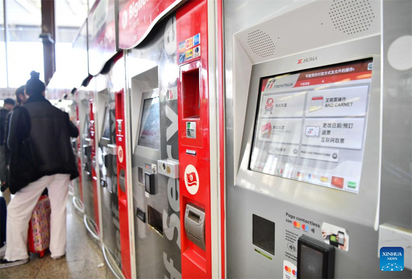 Esta foto tomada el 26 de marzo de 2023 muestra una máquina autoservicio expendedora de billetes con interfaz en chino en la estación de tren Roma Termini en Roma, Italia. Italia ha sido incluida en una segunda lista de 40 destinos bajo un programa piloto lanzado por China para reanudar los viajes en grupo al extranjero. A medida que aumenta nuevamente el número de vuelos de pasajeros entre los dos países, se esperan más turistas chinos. Ahora, muchas instalaciones públicas y áreas turísticas en Italia ofrecen servicios en idioma chino. (Xinhua/Jin Mamengni)