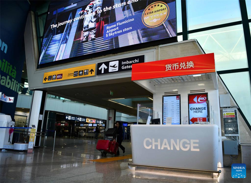 Esta foto tomada el 27 de marzo de 2023 muestra un letrero en chino en el aeropuerto de Fiumicino en Roma, Italia. Italia ha sido incluida en una segunda lista de 40 destinos bajo un programa piloto lanzado por China para reanudar los viajes en grupo al extranjero. A medida que aumenta nuevamente el número de vuelos de pasajeros entre los dos países, se esperan más turistas chinos. Ahora, muchas instalaciones públicas y áreas turísticas en Italia ofrecen servicios en idioma chino. (Xinhua/Jin Mamengni)