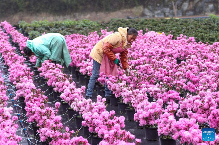 Agricultoras recortan flores en una base de cultivo de flores en el área administrativa de Bailidujuan en Bijie, provincia suroccidental china de Guizhou, el 28 de marzo de 2023. En los últimos años, el área administrativa de Bailidujuan en Bijie ha establecido invernaderos inteligentes para cultivar especies de flores alpinas como la azalea, con el objetivo de desarrollar el turismo rural y aumentar los ingresos de los agricultores locales. (Foto de Yao Lei/Xinhua)