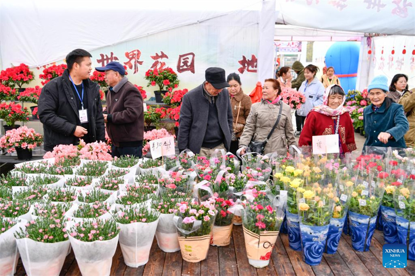 Turistas compran flores en un punto de muestra de flores en el área administrativa de Bailidujuan en Bijie, provincia suroccidental china de Guizhou, el 28 de marzo de 2023. En los últimos años, el área administrativa de Bailidujuan en Bijie ha establecido invernaderos inteligentes para cultivar especies de flores alpinas como la azalea, con el objetivo de desarrollar el turismo rural y aumentar los ingresos de los agricultores locales. (Xinhua/Yang Wenbin)