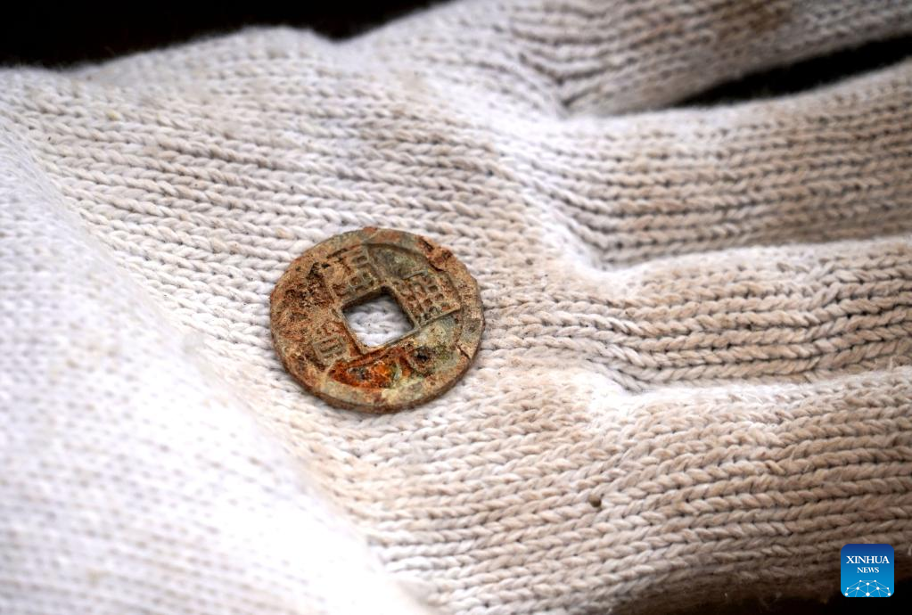 Esta foto tomada el 25 de marzo de 2023 muestra una moneda de bronce desenterrada de una tumba de la dinastía Tang (618-907) en el sitio de Songguogucheng, o las ruinas de la antigua capital del Estado de Song en el Período de Primavera y Otoño (770-476 aC), en Shangqiu, provincia central china de Henan. Los arqueólogos de la provincia central china de Henan han descubierto seis tumbas que datan de la dinastía Tang (618-907) entre dos antiguas murallas enterradas a diferentes profundidades, arrojando luz sobre estudios de sitios antiguos con múltiples capas culturales en la cuenca del río Amarillo. (Xinhua/Li An)