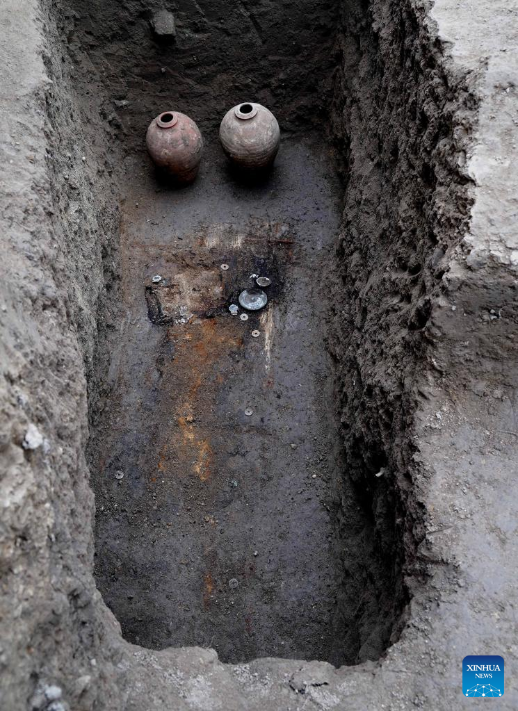 Esta foto tomada el 25 de marzo de 2023 muestra una tumba de la dinastía Tang (618-907) descubierta en el sitio de Songguogucheng, las ruinas de la antigua capital del Estado de Song en el Período de Primavera y Otoño (770-476 aC), en Shangqiu, provincia central china de Henan. Los arqueólogos de la provincia central china de Henan han descubierto seis tumbas que datan de la dinastía Tang (618-907) entre dos antiguas murallas enterradas a diferentes profundidades, arrojando luz sobre estudios de sitios antiguos con múltiples capas culturales en la cuenca del río Amarillo. (Xinhua/Li An)