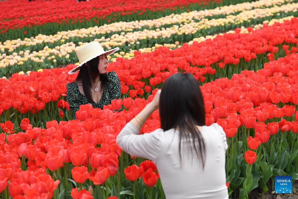 Esta foto muestra a una turista fotografiando a una compañera entre los tulipanes en la aldea de Wujiang de la ciudad de Hangping en el distrito de Pujiang, Jinhua, provincia oriental china de Zhejiang, el 28 de marzo de 2023. Recientemente, 100 mu (alrededor de 6,67 hectáreas) de tulipanes en plena floración han atraído a muchos turistas. Desarrollada por personas que regresaron a su ciudad natal para iniciar negocios, esta tierra no cultivada se transformó en campos de tulipanes y se abrió a los visitantes de forma gratuita. Los servicios de pedido de flores frescas también están disponibles para aumentar los ingresos de los agricultores locales. (Xinhua/Weng Xinyang)