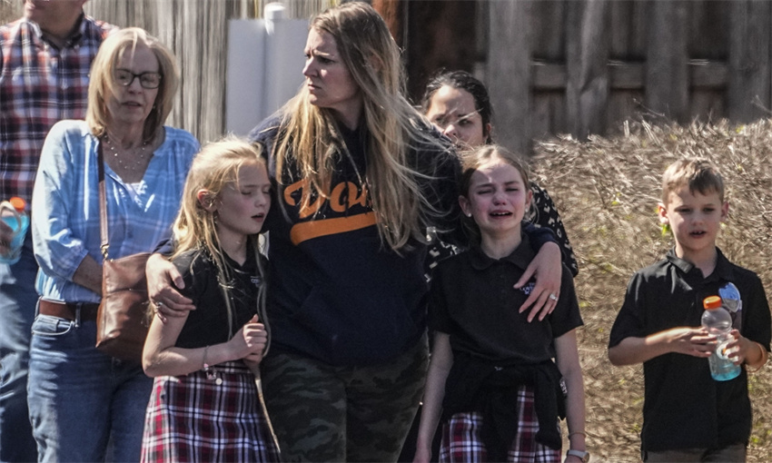Niños y una mujer salen del centro de encuentro en la iglesia bautista Woodmont después de un tiroteo escolar el 27 de marzo de 2023 en Nashville, Tennessee. Según los informes iniciales, tres estudiantes y tres adultos cayeron a manos de la agresora de 28 años. La mujer cayó abatida por la policía en el lugar de los hechos. Foto: AFP