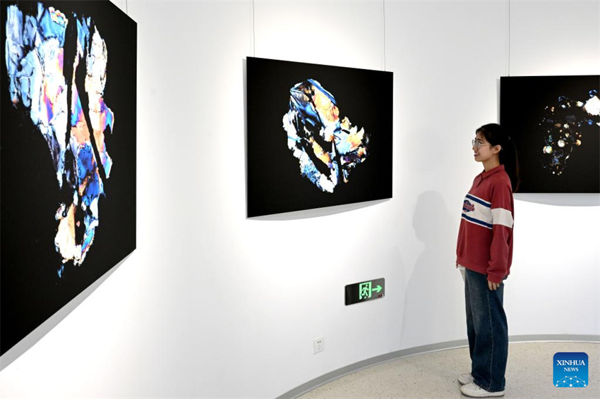 Una visitante observa micrografías polarizadas cruzadas de partículas del suelo lunar en una exposición temática sobre los logros de investigación del suelo lunar en la Universidad de Ciencia y Tecnología de China, en Hefei, provincia oriental china de Anhui, el 19 de abril de 2023. La exposición que comienza el lunes muestra obras realizadas por científicos, artistas e ingenieros basadas en micrografías de partículas del suelo lunar traídas por la sonda Chang'e-5. En 2020, la misión Chang'e-5 de China extrajo muestras de la Luna que pesaban alrededor de 1.731 gramos. (Xinhua/Huang Bohan)