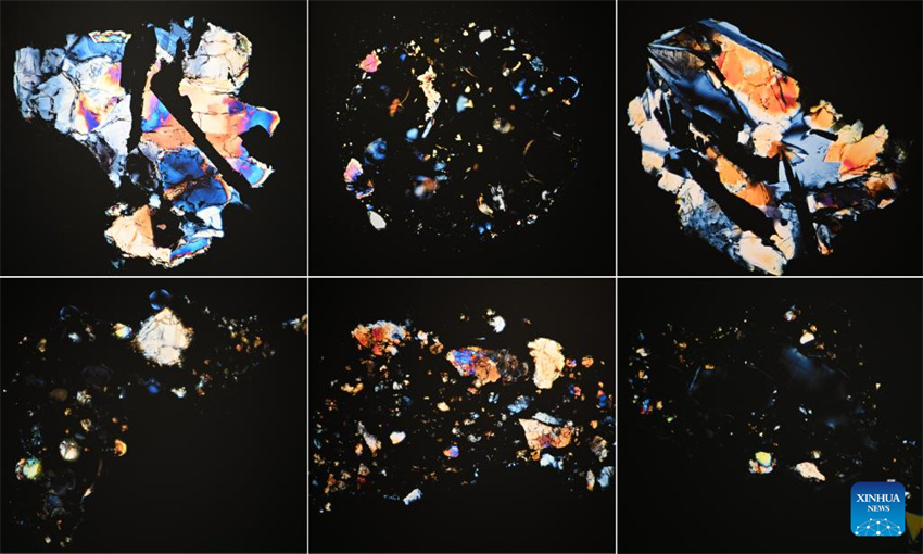 Esta foto combinada muestra micrografías polarizadas cruzadas de diferentes partículas del suelo lunar que se muestran en una exposición temática sobre los logros de investigación del suelo lunar en la Universidad de Ciencia y Tecnología de China, en Hefei, provincia oriental china de Anhui, el 19 de abril de 2023. La exposición que comienza el lunes muestra exhibiciones hechas por científicos, artistas e ingenieros basadas en micrografías de partículas del suelo lunar traídas por la sonda Chang'e-5. En 2020, la misión Chang'e-5 de China extrajo muestras de la Luna que pesaban alrededor de 1.731 gramos. (Xinhua)