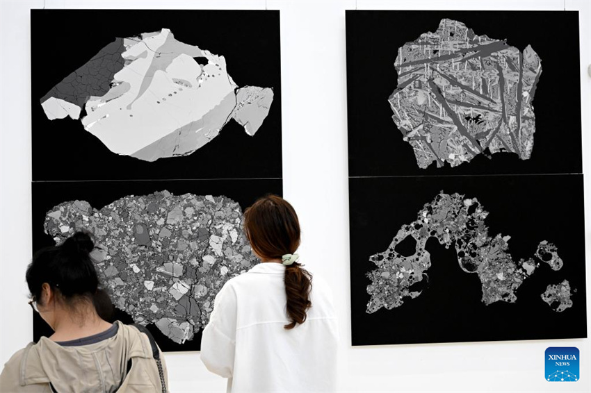 Las visitantes observan micrografías de electrones retrodispersados de partículas del suelo lunar en una exposición temática sobre los logros de investigación del suelo lunar en la Universidad de Ciencia y Tecnología de China, en Hefei, provincia oriental china de Anhui, el 19 de abril de 2023. La exposición que comienza el lunes muestra obras realizadas por científicos, artistas e ingenieros basadas en micrografías de partículas del suelo lunar traídas por la sonda Chang'e-5. En 2020, la misión Chang'e-5 de China recuperó muestras de la Luna que pesaban alrededor de 1.731 gramos. (Xinhua/Huang Bohan)