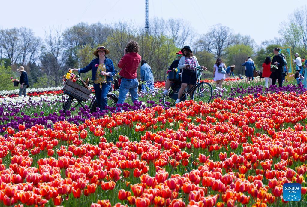 Los visitantes posan para hacerse unas fotos con tulipanes en una granja de recolección de tulipanes en Fenwick, Ontario, Canadá, el 10 de mayo de 2023. (Foto de Zou Zheng/Xinhua)