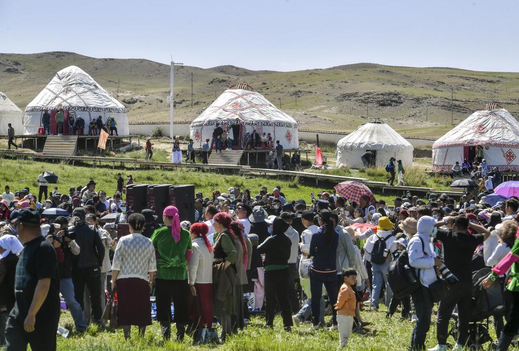 Un grupo de personas participa en diversas actividades folclóricas que promueven la cultura nómada local en el distrito de Fuhai, región autónoma uigur de Xinjiang, en el noroeste de China, 3 de junio de 2023. La agenda marca el inicio del traslado del ganado hacia los pastizales de verano. [CGTN]