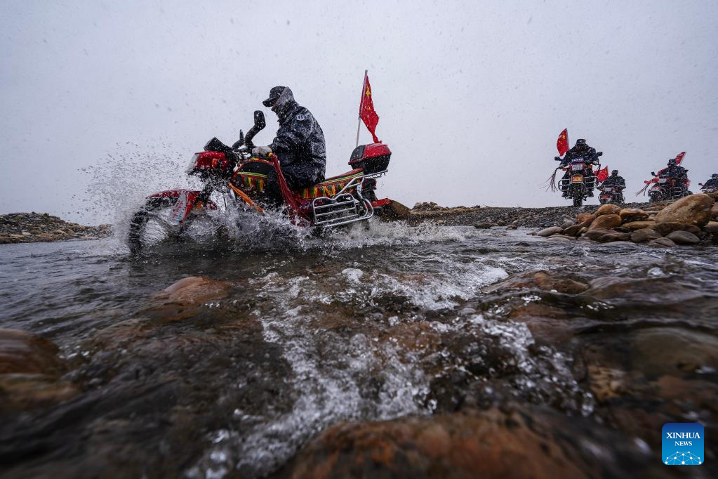 Miembros del equipo de defensa fronteriza patrullan en motocicletas en el municipio de Changgo de la ciudad de Xigaze, región autónoma del Tíbet en el suroeste de China, el 2 de junio de 2023. El municipio de Changgo, con una elevación promedio de más de 5.000 metros, es un municipio fronterizo adyacente a Nepal con una frontera de 105 kilómetros.