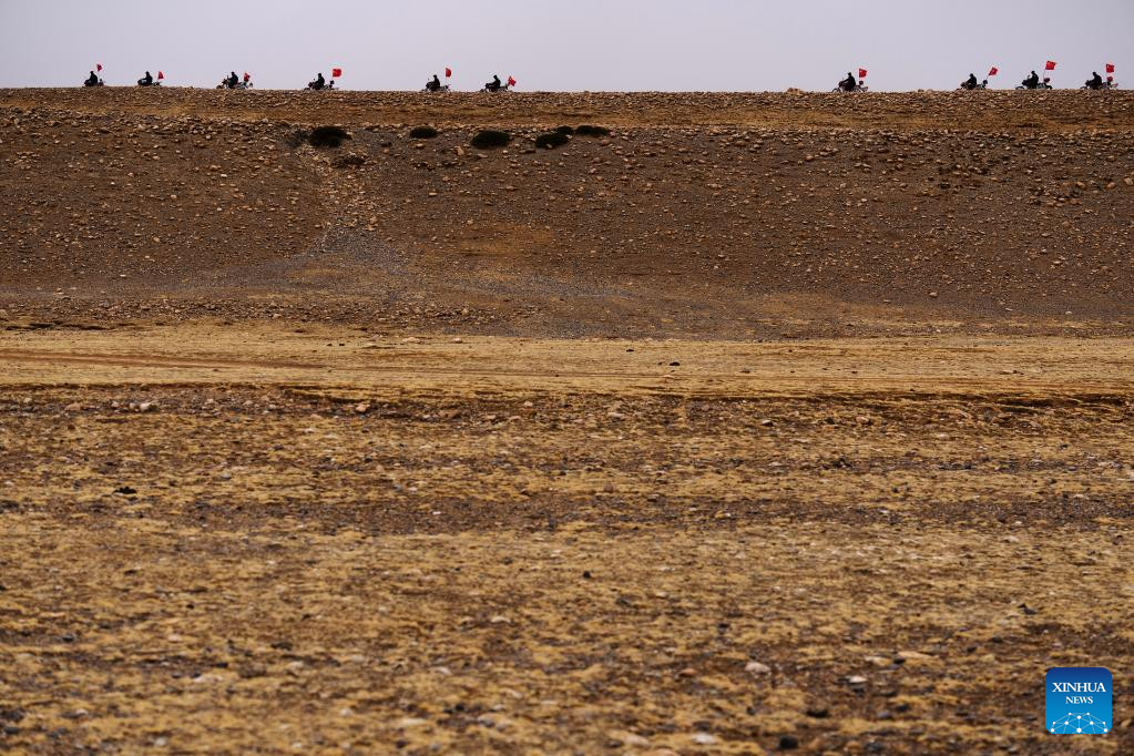 Miembros del equipo de defensa fronteriza patrullan en motocicletas en el municipio de Changgo de la ciudad de Xigaze, región autónoma del Tíbet en el suroeste de China, el 2 de junio de 2023. El municipio de Changgo, con una elevación promedio de más de 5.000 metros, es un municipio fronterizo adyacente a Nepal con una frontera de 105 kilómetros.