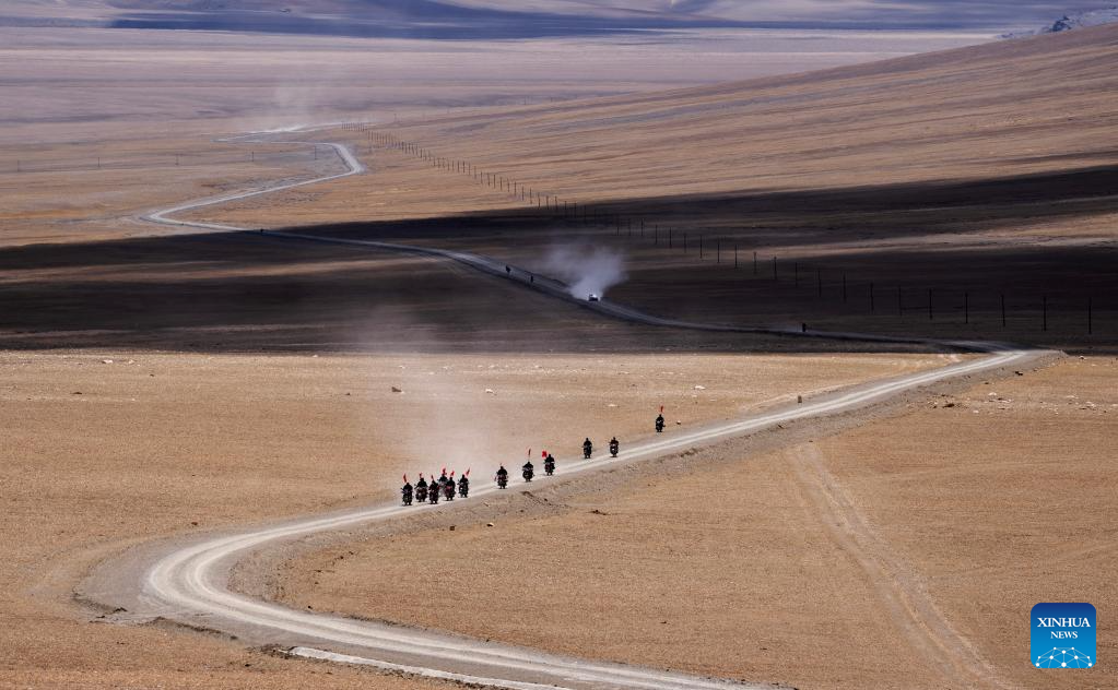 Miembros del equipo de defensa fronteriza patrullan en motocicletas en el municipio de Changgo de la ciudad de Xigaze, región autónoma del Tíbet en el suroeste de China, el 2 de junio de 2023. El municipio de Changgo, con una elevación promedio de más de 5.000 metros, es un municipio fronterizo adyacente a Nepal con una frontera de 105 kilómetros.