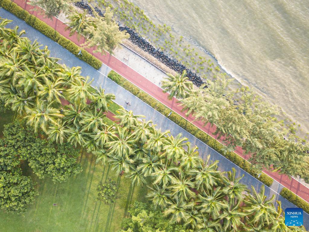 Esta foto aérea tomada el 1 de septiembre de 2023 muestra a un turista paseando en bicicleta por la costa de la bahía de Haikou, en la provincia de Hainan, sur de China. En los últimos días, el Ministerio de Ecología y Medio Ambiente de China publicó el segundo lote de casos de hermosas bahías, en el que enumeró 12 ejemplos, incluidos los de la bahía de Haikou y la bahía de Sanya de Hainan. Un caso de hermosa bahía debe proporcionar un elegante paisaje costero, un entorno armonioso y productos ecológicos de alta calidad. (Xinhua/Pu Xiaoxu)