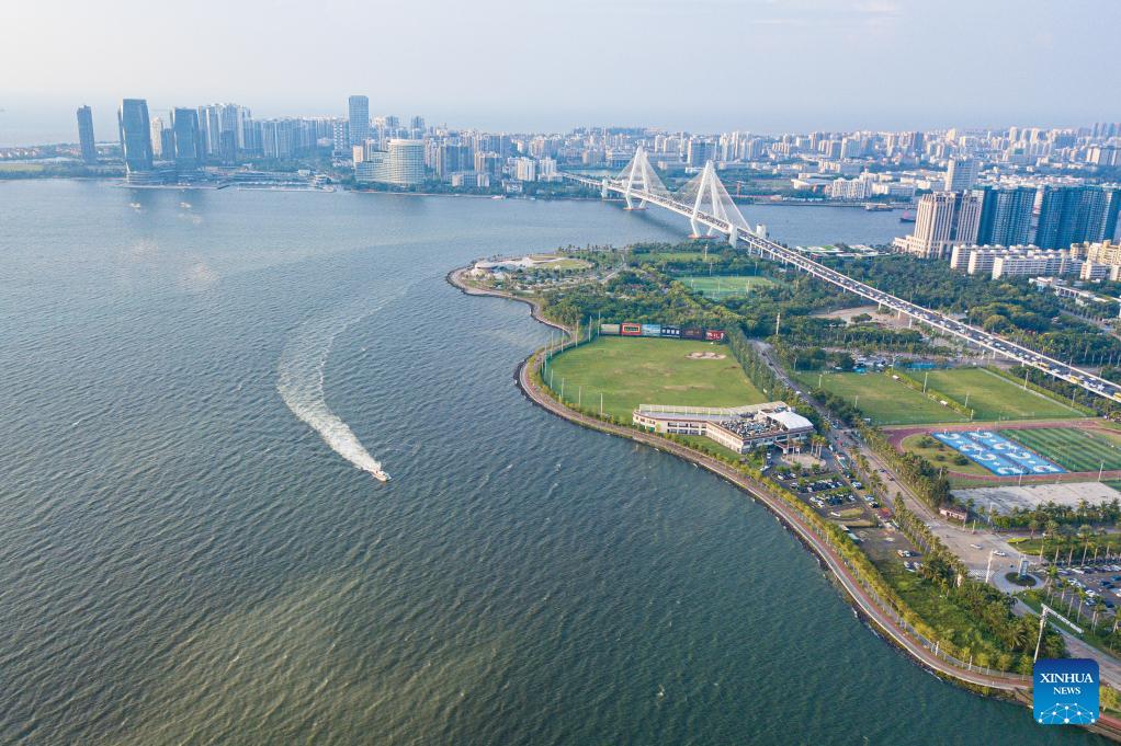Esta foto aérea tomada el 1 de septiembre de 2023 muestra el paisaje de la bahía de Haikou provincia de Hainan, sur de China. En los últimos días, el Ministerio de Ecología y Medio Ambiente de China publicó el segundo lote de casos de hermosas bahías, en el que enumeró 12 ejemplos, incluidos los de la bahía de Haikou y la bahía de Sanya de Hainan. Un caso de hermosa bahía debe proporcionar un elegante paisaje costero, un entorno armonioso y productos ecológicos de alta calidad. (Xinhua/Pu Xiaoxu)