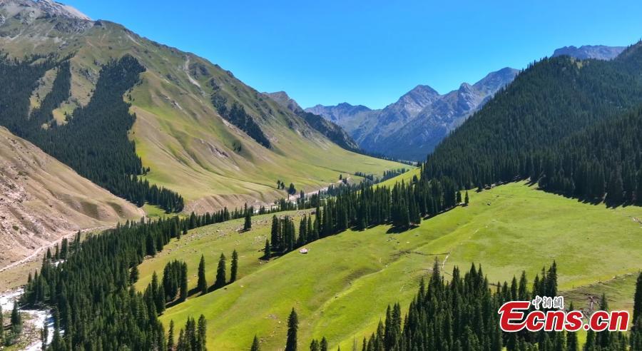 Fotografía de un arroyo serpenteante rodeado por las montañas Tianshan en el distrito de Jinghe, prefectura autónoma de la etnia mongola de Bortala, al noroeste de la región autónoma uigur de Xinjiang, en el noroeste de China. (Foto: China News Service/Zhong Dawei)