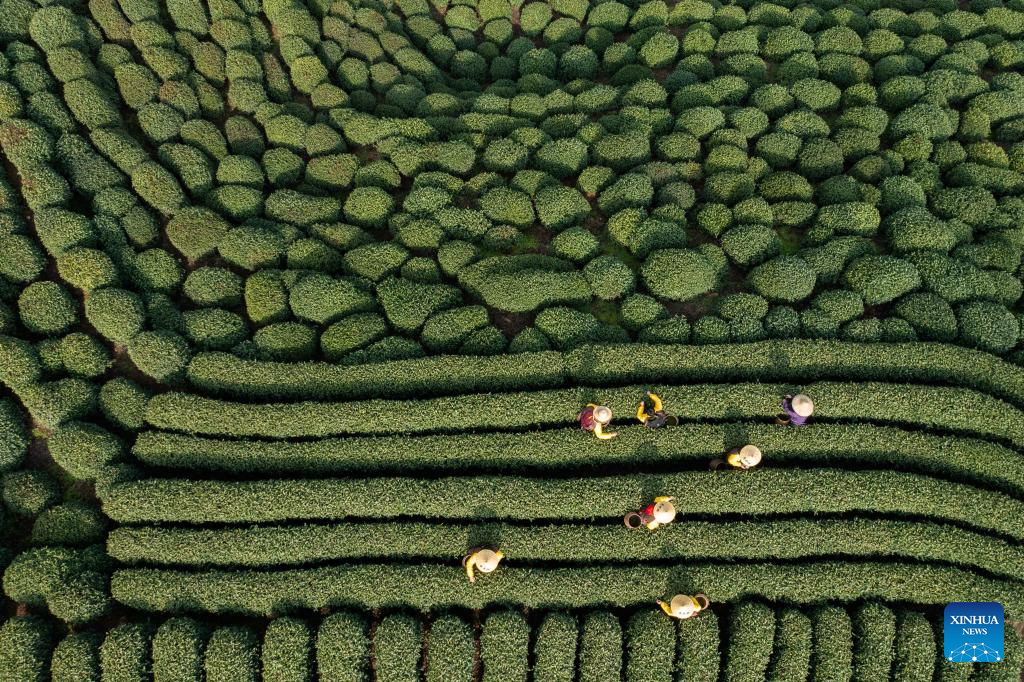 La foto aérea del 13 de marzo de 2023 muestra a agricultores recogiendo hojas de té en una plantación en Hangzhou, provincia oriental china de Zhejiang.