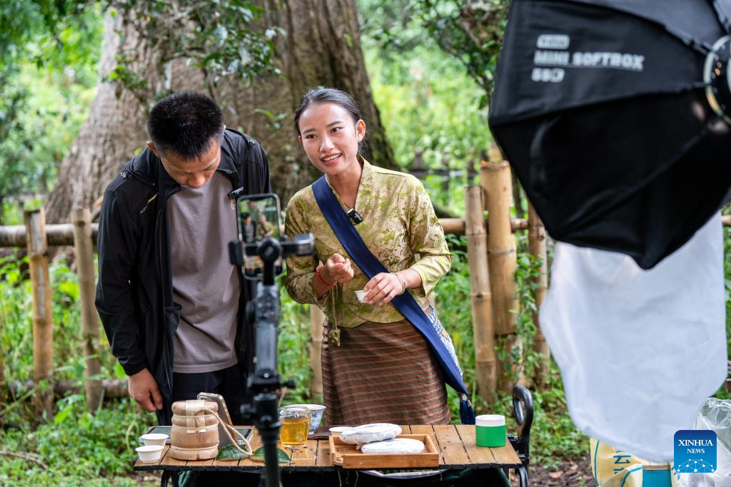 Una pareja de aldeanos promueve los productos de té Pu'er a través de la transmisión en vivo en un antiguo bosque de té de la montaña Jingmai en Pu'er, provincia de Yunnan, suroeste de China, el 17 de septiembre de 2023.