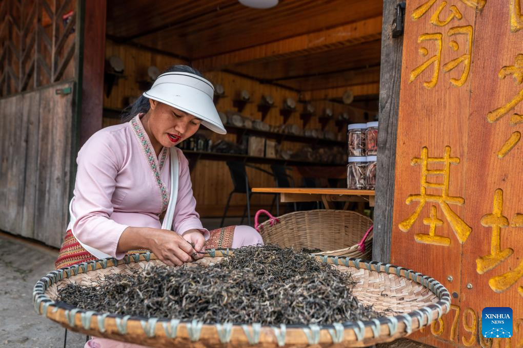 Una agricultora de té selecciona hojas de té en una aldea tradicional de la montaña Jingmai en Pu'er, provincia de Yunnan, suroeste de China, el 16 de septiembre de 2023.