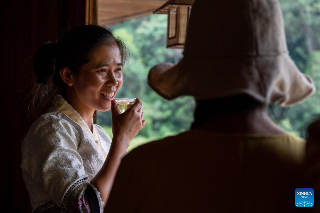 Una aldeana (a la izquierda) presenta su té Pu'er casero a una turista en una aldea tradicional de la montaña Jingmai en Pu'er, provincia de Yunnan, suroeste de China, el 14 de septiembre de 2023.