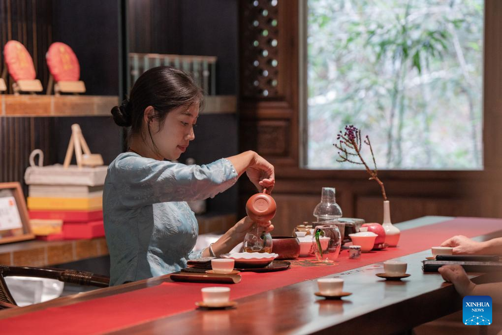 Una aldeana sirve té para los clientes en una fábrica de té de la montaña Jingmai en Pu'er, provincia de Yunnan, suroeste de China, el 14 de septiembre de 2023.