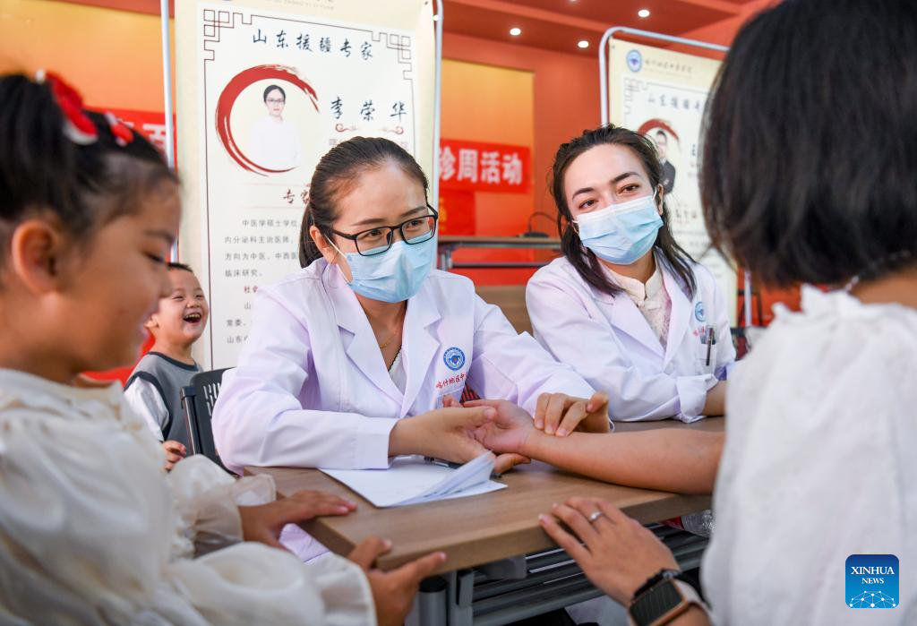 Una trabajadora médica de la provincia oriental china de Shandong ofrece consultas gratuitas en Kashgar, región autónoma uigur de Xinjiang, noroeste de China, el 16 de septiembre de 2023. Los trabajadores médicos de la provincia oriental china de Shandong han proporcionado servicios médicos a la población local en Kashgar. (Xinhua/Wang Fei)
