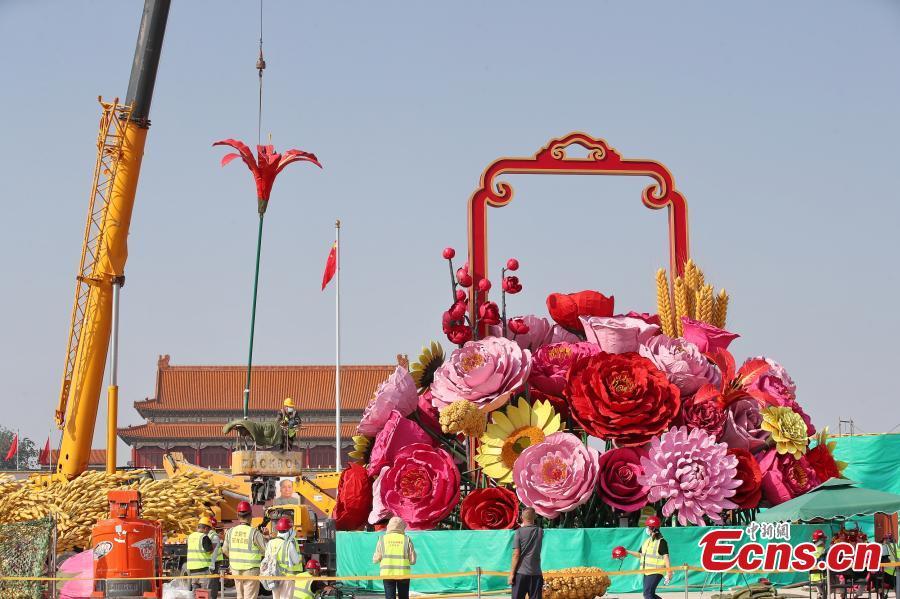 Una canasta de flores gigante adorna la Plaza de Tiananmen, Beijing, con motivo del Día Nacional