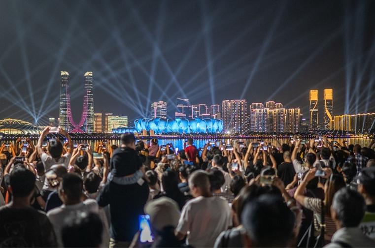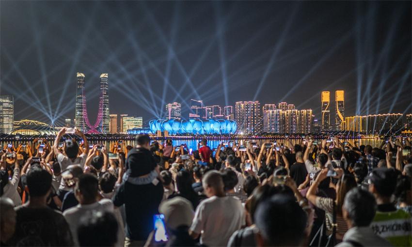 Personas en el paseo del río Qiantang disfrutan del espectáculo de luces del Estadio del Centro Deportivo Olímpico de Hangzhou de cara a los Juegos Asiáticos 2022 en Hangzhou, provincia oriental china de Zhejiang, 19 de septiembre de 2023. VCG