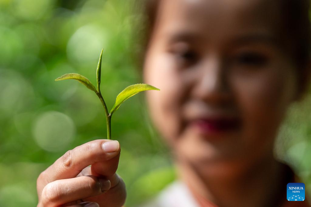 Una recolectora muestra hojas de té recogidas en un antiguo bosque de té de la montaña Jingmai en Pu'er, provincia de Yunnan, suroeste de China, el 19 de septiembre de 2023. Los productores locales de té de la zona están ocupados recogiendo hojas de té en la temporada de cosecha para satisfacer la demanda del mercado. (Xinhua/Hu Chao)
