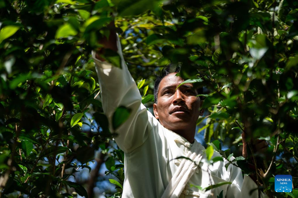 Un agricultor recoge hojas de té en un antiguo bosque de té de la montaña Jingmai en Pu'er, provincia de Yunnan, suroeste de China, el 19 de septiembre de 2023. Los productores locales de té de la región están ocupados recogiendo hojas de té en la temporada de cosecha para satisfacer la demanda del mercado. (Xinhua/Hu Chao)