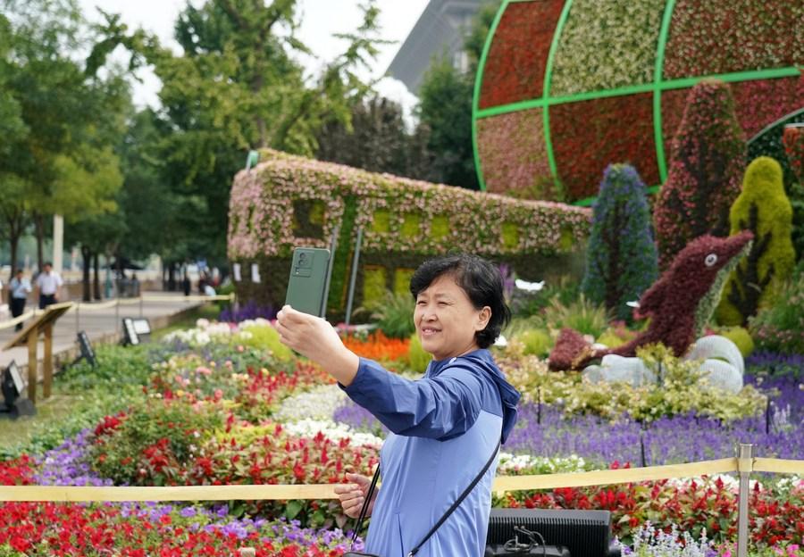 Una mujer se toma fotos con una decoración floral en la zona de Xidan en Beijing, capital de China, 25 de septiembre de 2023. (Xinhua/Zhang Chenlin)
