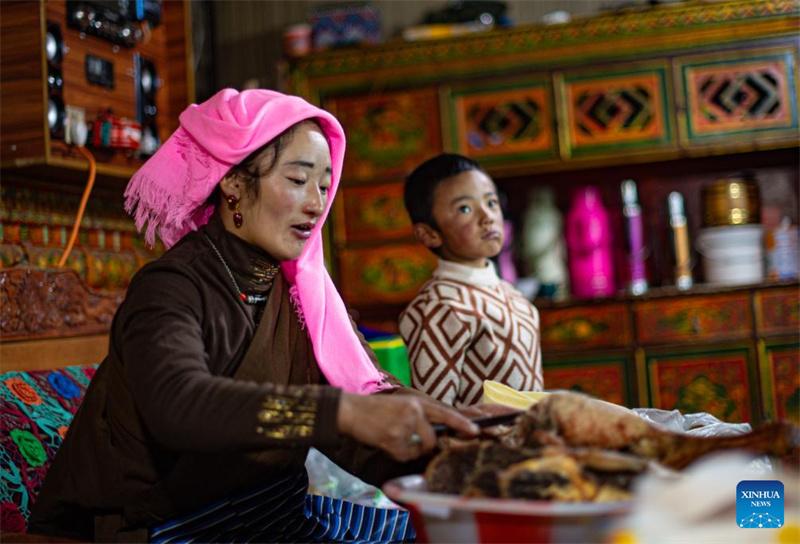 Una pastora corta carne de res para su hijo en un pastizal de invierno en la aldea de Dabug, en el distrito de Damxung, en la región autónoma de Xizang, en el suroeste de China