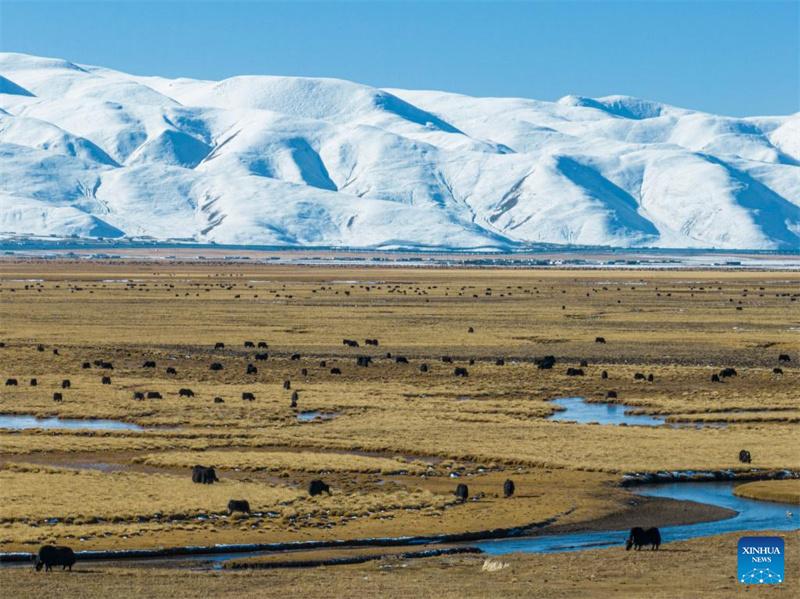 Esta foto aérea tomada el 11 de noviembre de 2023 muestra un pastizal en el distrito de Damxung, en la región autónoma de Xizang, en el suroeste de China. (Xinhua/Sun Fei)