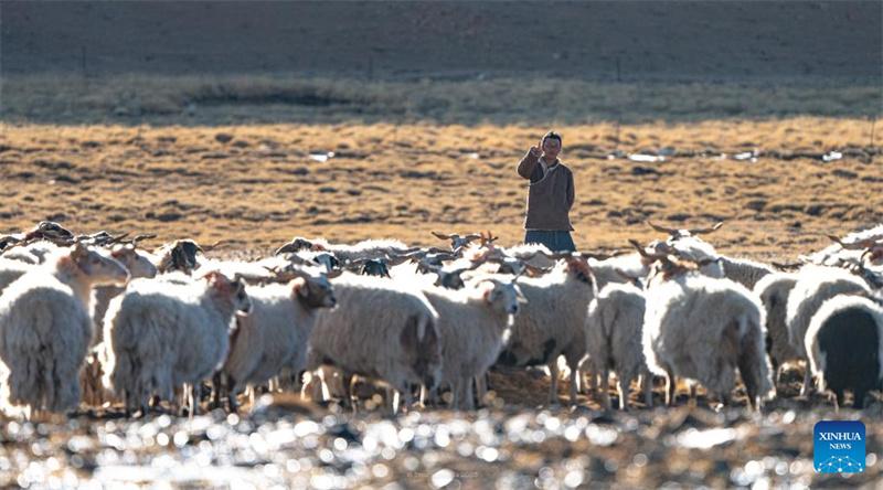 Yonten vigila a sus ovejas en un pasto de invierno en la aldea de Dabug, en el distrito de Damxung, en la región autónoma de Xizang, suroeste de China, el 10 de noviembre de 2023. (Foto de Tenzin Nyida/Xinhua)