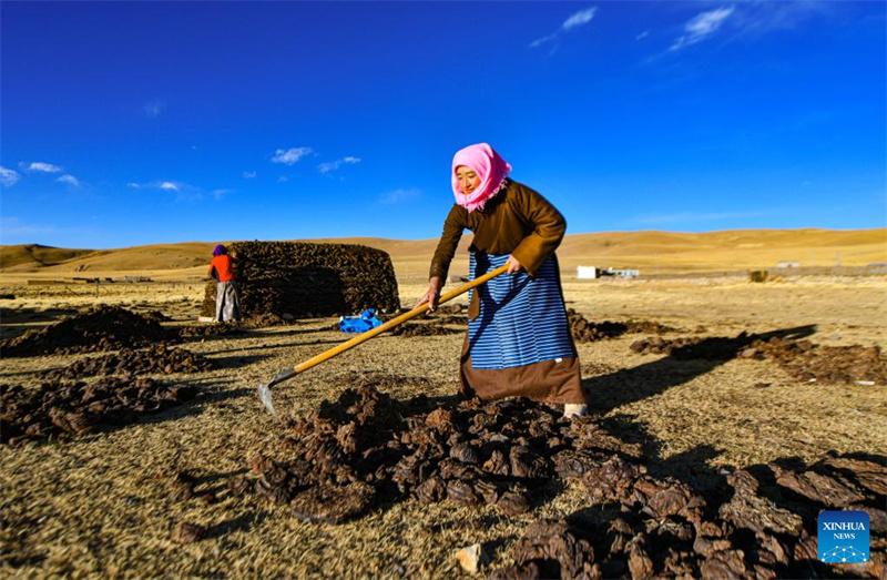 Una pastora apila y apelmaza estiércol de vaca con el fin de usarlo combustible de calefacción en un pastizal de invierno en la aldea de Dabug del distrito de Damxung, en la región autónoma de Xizang, suroeste de China, el 10 de noviembre de 2023. (Xinhua/Jigme Dorje)
