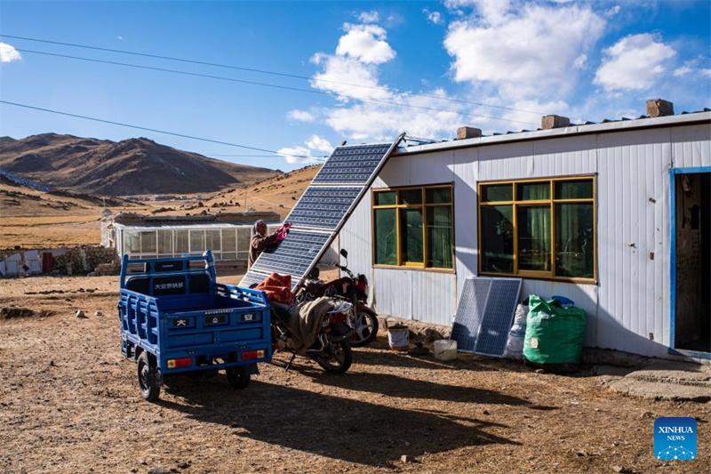Yonten desempolva los paneles solares en un pastizal de invierno en la aldea de Dabug del distrito de Damxung, en la región autónoma de Xizang, suroeste de China, el 10 de noviembre de 2023. (Xinhua/Sun Fei)